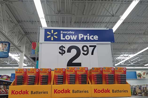 Unless you’re buying store-brand, batteries are pretty much the same. There’s a negligible difference between Energizer and Duracell, but not enough for it to really matter. That being said, batteries at Walmart will cost you much more than if you purchased them at Costco or Sam’s Club. Yeah, you’ll have 50 batteries, but they’ll last forever. If you buy at Walmart, you'll be paying almost the same price for a pack of 10  batteries or less.